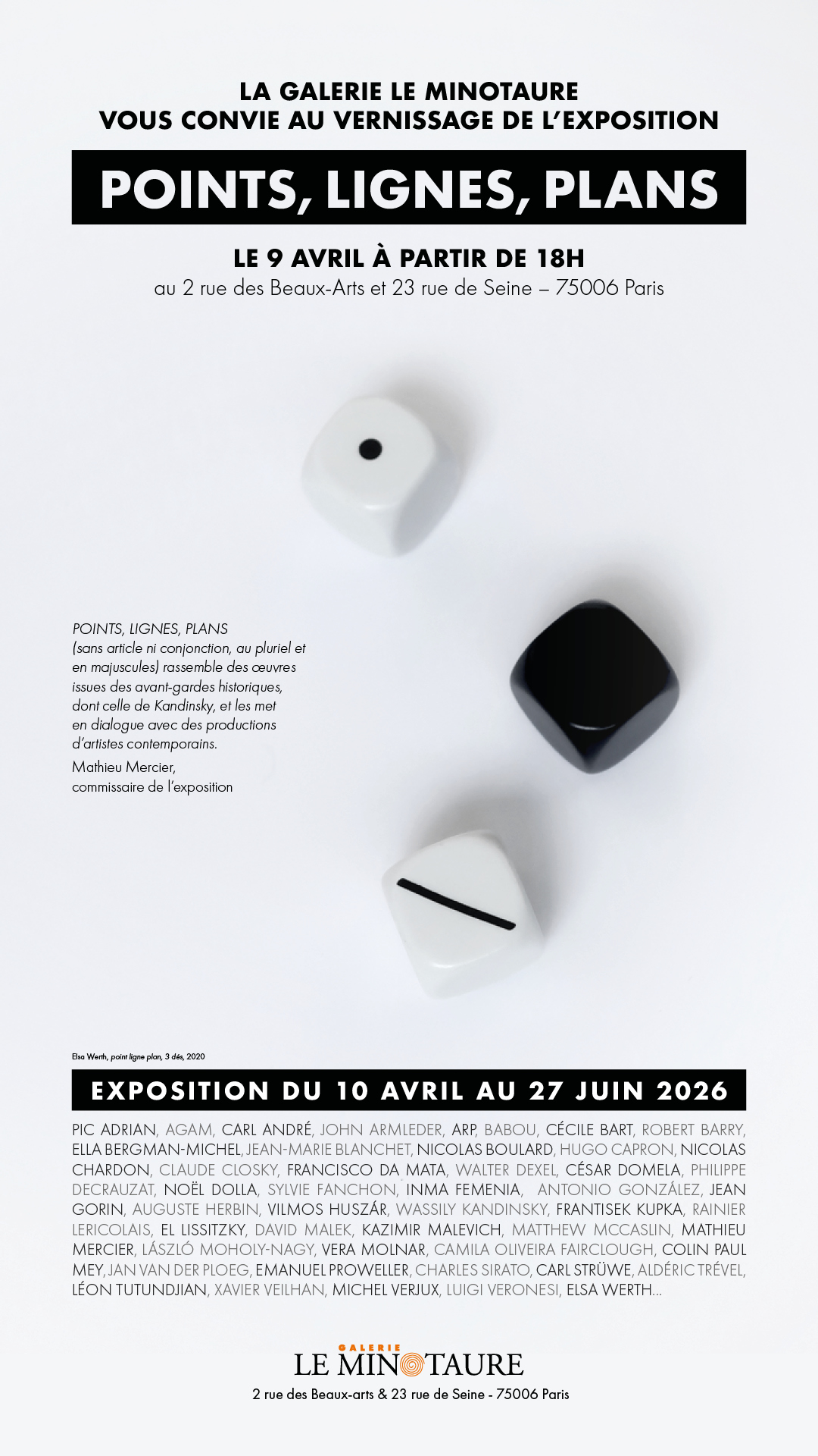 POINTS, LIGNES, PLANS (sans article ni conjonction, au pluriel et en majuscules) rassemble des œuvres issues des avant-gardes historiques, dont celles de Kandinsky, et les met en dialogue avec des productions d’artistes contemporains. Toutes abstraites, ces œuvres partagent une démarche fondée sur la réduction, la rationalisation et l’autonomie du langage plastique, à travers l’usage de formes simples.